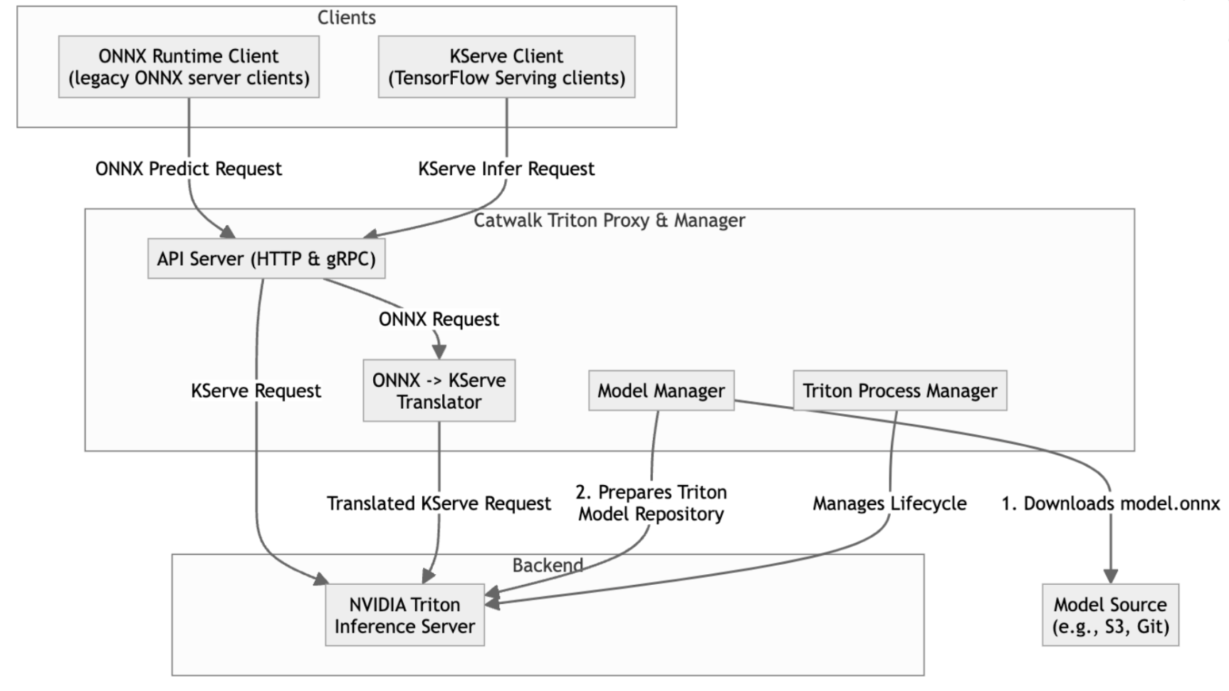 Finally, a special mode in the Triton server manager is implemented to allow the Triton Inference Server (TIS) to be backward compatible with the command line interface of the existing ONNX runtime server used in Catwalk.